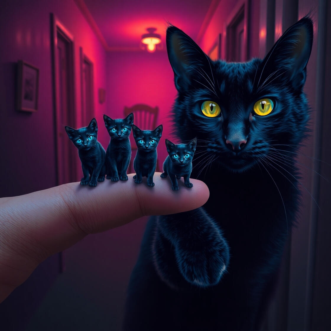 They flicker, unstable—not quite real, not quite artificial. Their glowing eyes scan, watching from the cracks between worlds. They do not blink. They do not meow. They simply exist.If you see one, it has already seen you.